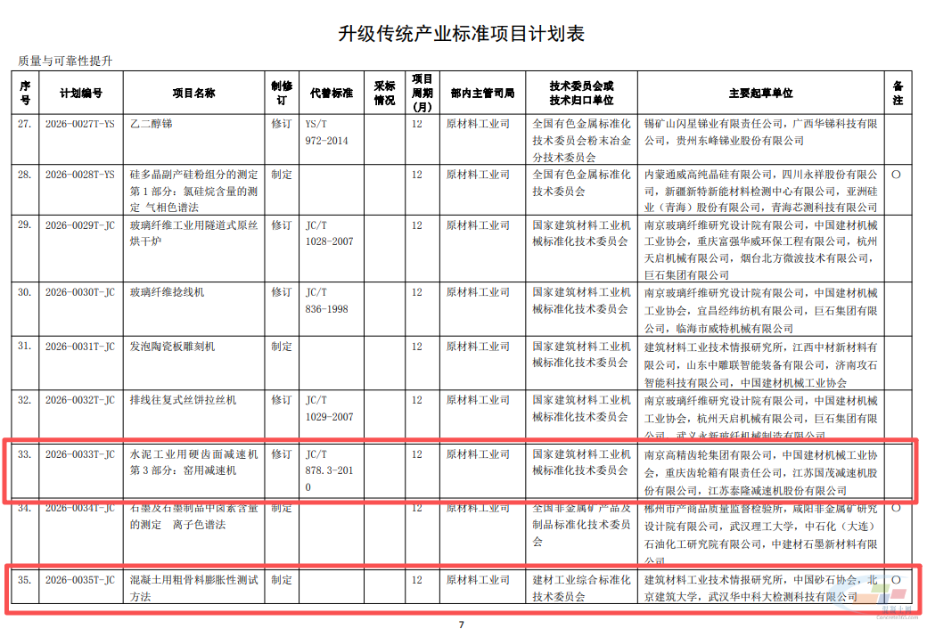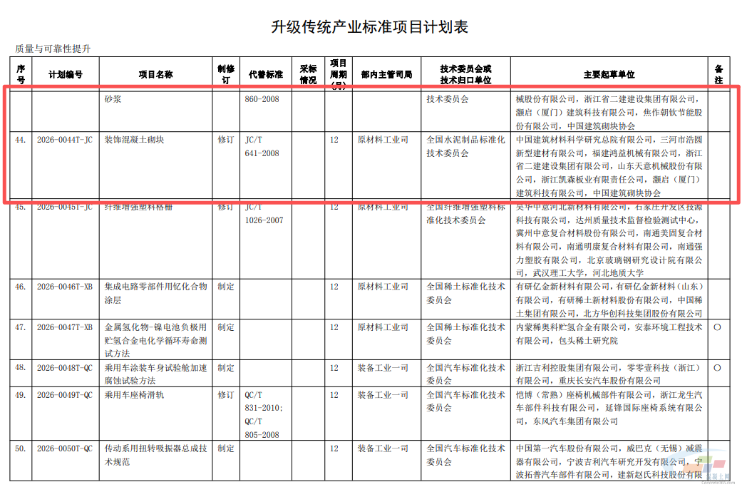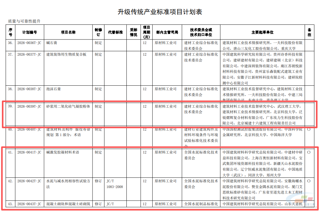 其中,水泥工业用硬齿面减速机第 3 部分:窑用减速机;混凝土用粗骨料膨胀性测试方法;砂浆用二氧化硅气凝胶粉体;碱激发胶凝材料术语;水泥与减水剂相容性试验方法;混凝土砌块和混凝土砖砌筑砂浆;装饰混凝土砌块等被列入升级传统产业标准项目计划表。