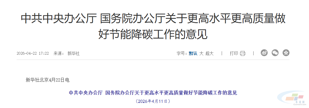4月22日,中共中央办公厅、国务院办公厅印发《关于更高水平更高质量做好节能降碳工作的意见》(以下简称《意见》),作为国家层面统筹节能降碳与绿色发展的纲领性文件,将水泥所属的建材行业明确列为工业节能降碳重点领域。此举标志着水泥行业节能降碳从专项治理迈向全面深化、从单一管控转向系统协同的新阶段,对行业产能结构、技术路径、成本效益与发展模式将产生全方位、深层次的重塑效应。